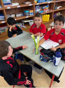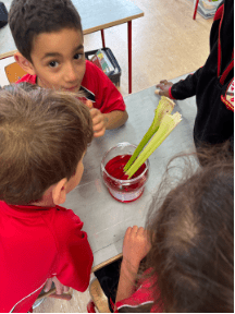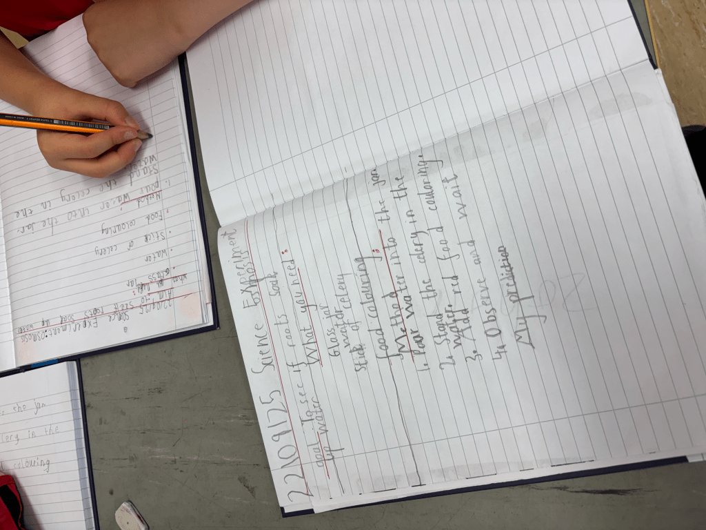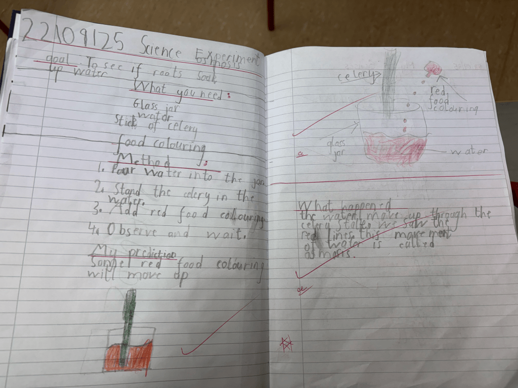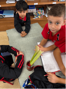 We were fascinated by how big the roots of some trees were on our walk. Once we learned that roots have the important job of soaking up water and nutrients from the ground to the tree, we set about predicting, testing, observing and recording the process.
