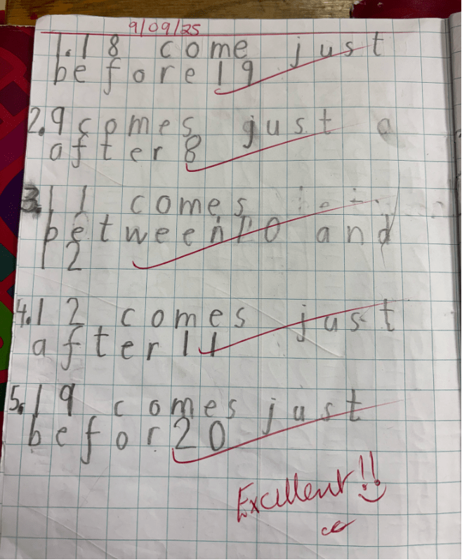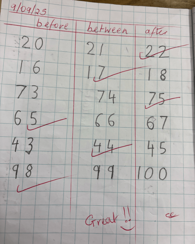 We needed to learn some maths language to help us use our number lines and hundred squares properly. We learned before and after, next, counting forwards, counting back and between.