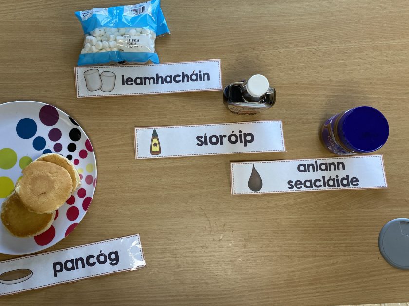Bhí na buachaillí ag foghlaim faoi Lá na bPancóg an tseachtain seo. Léigh siad conas pancóga a dhéanamh. Nuair a bhí sé in am na pancóga a ithe, d’ordaigh siad iad as Gaeilge! Bhí rogha iontach acu: síoróip, anlann seacláide, leamhacháin nó banana